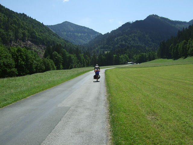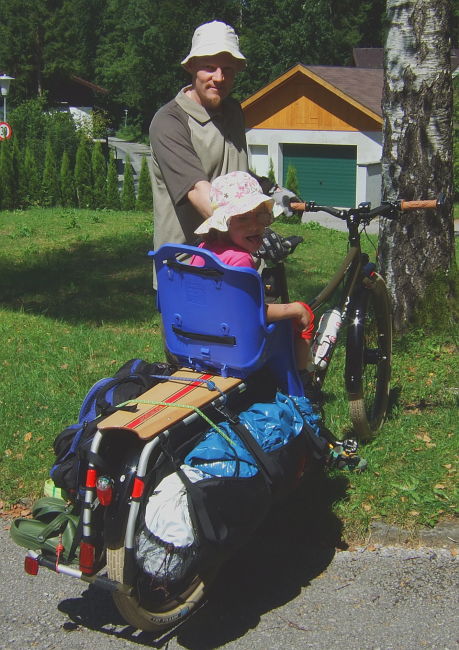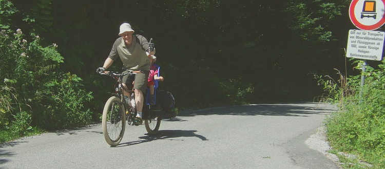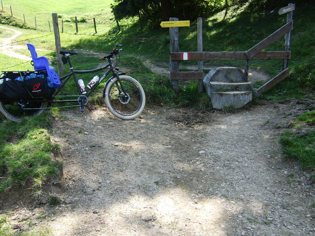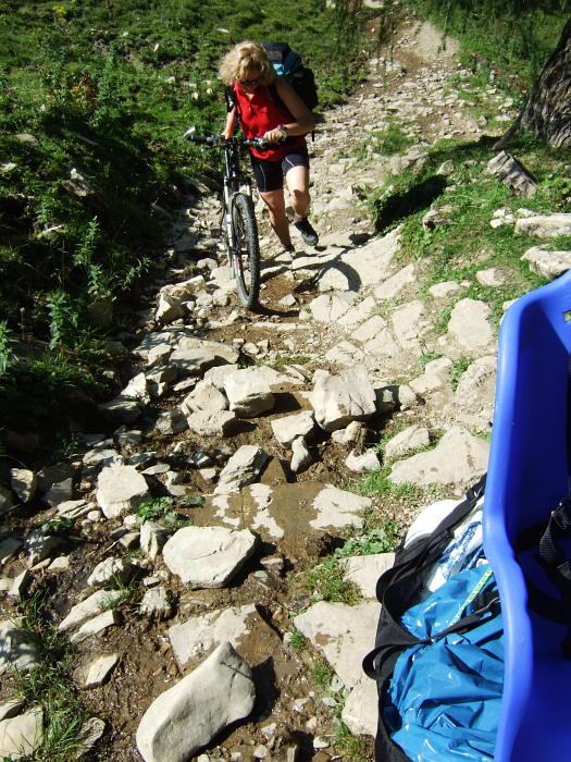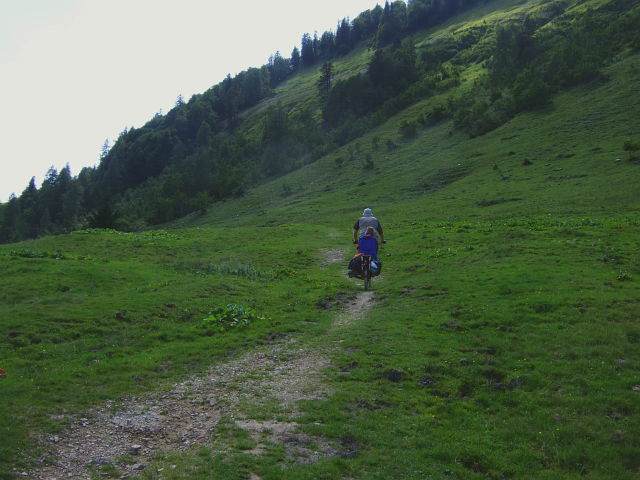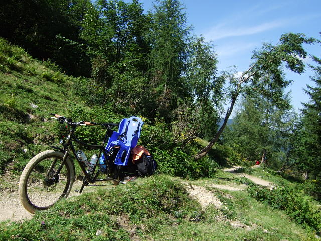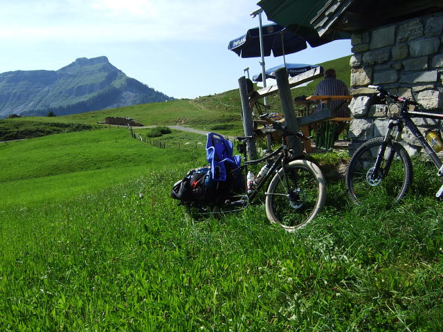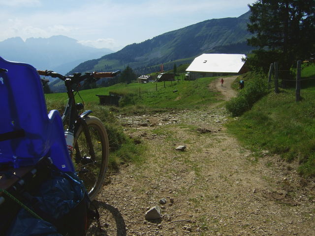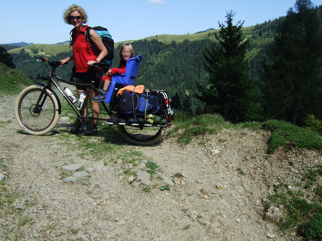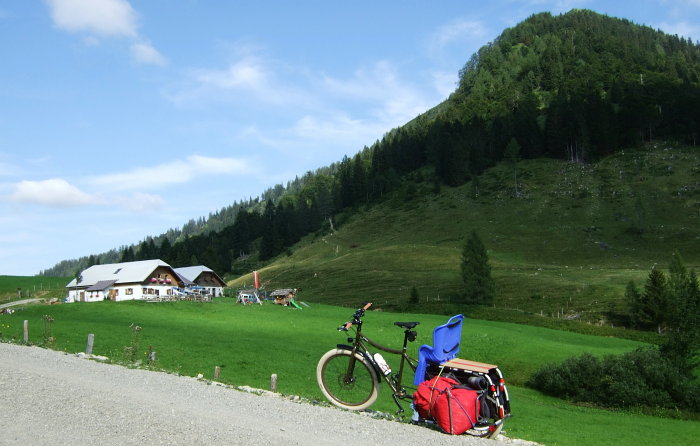 This Thursday we started for a family hiking trip to the Bergalm located 25km from our home. We planned to reside at the Neureith house for 2 nights and do some hiking there. The trip was planned only with bicycle and walking, no car. First day with arrival was nice weather and everything went perfectly, though it took some time with breaks every now and then. With my Alfine 8-speed setup in the big dummy some uphills were not extremely comfortable to ride with all the baggage and the little co-rider, but I was surprised I did it. There was some lack of tire traction at steep gravel climbs and the wideloader I had mounted for transporting our big and heavy hiking boots hit the ground several times when balancing through the rocks, but no problems so far. When reaching our target, the Neureith house, our friends who had been starting from the opposite side of the ridge had not yet arrived. They were walking up the Bergalm with their 3 kids. I got rid of our baggage, rode down the south side to meet them and got some big and heavy back pack up to the house for them.