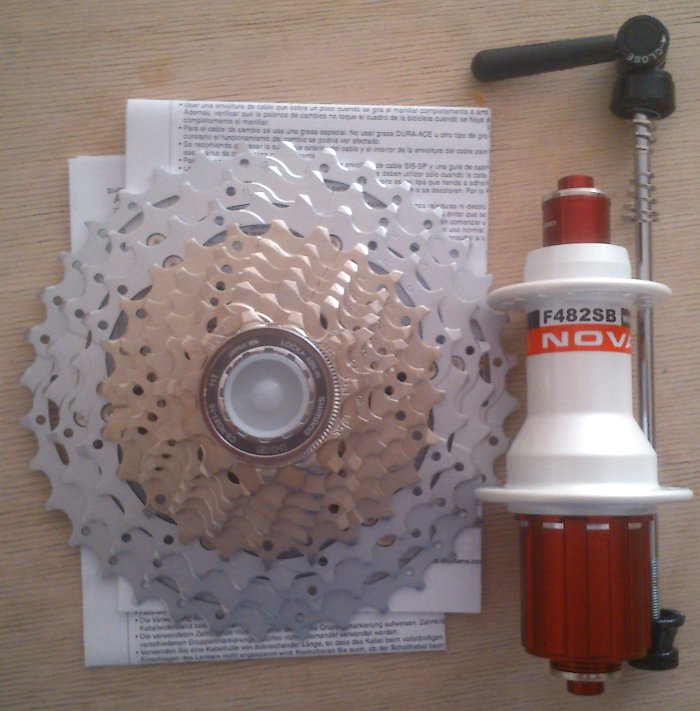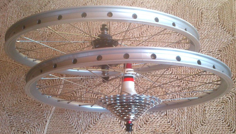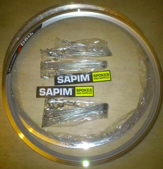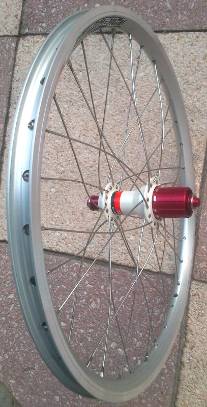 Geplant sind sind stabile aber dennoch leichte, tourentaugliche Räder, vorne mit SON XS Nabendynamo, hinten mit einer sehr hübschen und leichten Novatec Nabe in weiß, Alexrims DA16 Felgen mit Durchmesser 406mm (20″), Sapim Laser Speichen. Es hätte hinten zwar keiner 32 Speichen bedurft, aber die Novatec Nabe war nicht mit 28 Loch zu kriegen. Das Hinterrad wiegt 740g, ohne Felgenband, Schnellspanner, Ritzelpaket gewogen. Das am letzten Bild zu sehende Vorderrad mit schwarzem SON 20R Nabendynamo kann beim Tern nicht verwendet werden, da der SON 20R 100mm Achsbreite hat, das Tern aber nur 74mm. Vielleicht bringe ich es irgendwann zusammen mit einer Gabel- und Scheibenbremsumrüstung am Tern zum Einsatz.