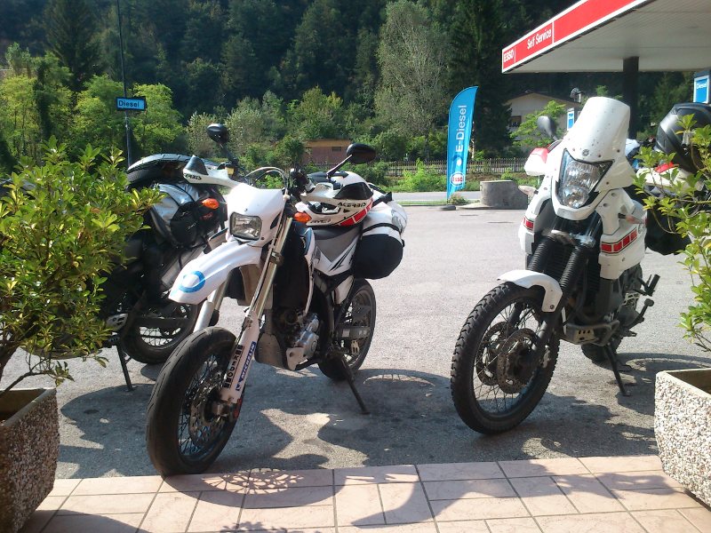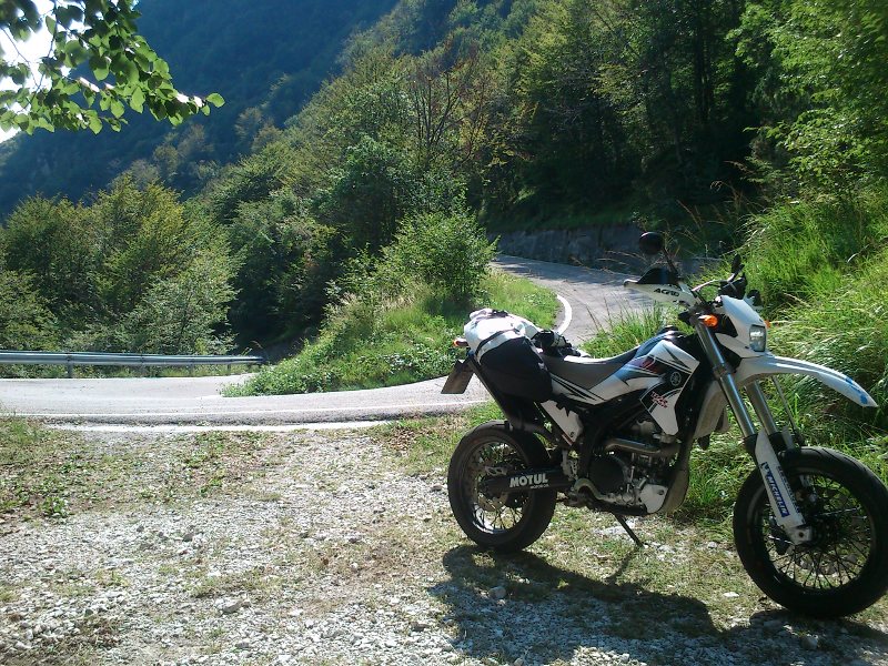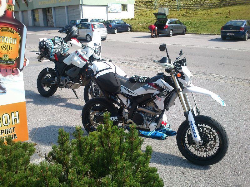 Zur WR250R ist zu sagen, daß sie bei den typischen Dolomitenpässen mühsam zu fahren ist, da über 1700m trotz der Kraftstoffeinspritzung eine sehr starke Reduktion der Motorleistung spürbar ist, und vor allem überhaupt nurmehr bei hoher Drehzahl gefahren werden kann. Bei den immer verstopften Dolomiten-Passstrassen kann das sehr zäh, unnötig lärmig und anstrengend zu fahren werden. Es rächte sich dabei die längere Übersetzung von 14/42, welche ich beim Supermoto-Umbau meiner WR bisher zum entspannteren und verbrauchsärmeren Pendeln genutzt habe. Zum Kehrenfahren auf größerer Höhe ist das völlig ungeeignet, da kein Ganganschluß in den unteren Gängen mehr besteht. Zum nächsten Pässefahren wird auf Serienübersetzung 13/42 (Serie bei WR250X) umgebaut, auch wenn die Anreise dann leider etwas hochtouriger erfolgen muß.