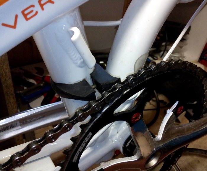 Selbst bei wildem Kurbeln und Schalten in der Montageaufhängung gab es nun keinerlei Kettenabspringer mehr. Ohne dieses Teil fliegt die Kette praktisch bei jedem unbedachten Gangwechsel auf kleinere Ritzel vom Kettenblatt.