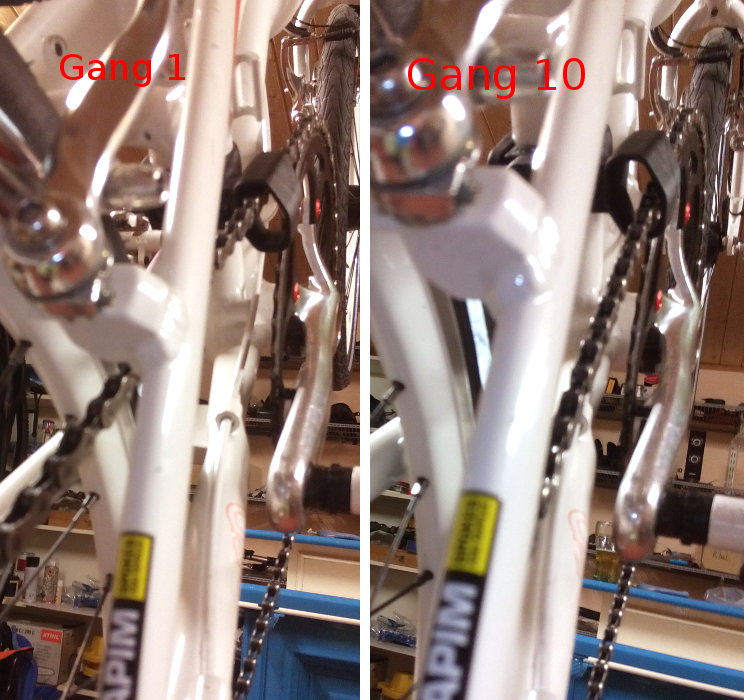 Und hier hat man einen visuellen Vergleich der Kettenlinie zwischen den Extremposition 1.Gang und 10.Gang. Die Ketten schleift nie in der Führungsöse. Zwischen der Aussenseite der Führungsöse und dem inneren Pedalarm wird es beim Vorbeikurbeln allerdings recht eng.