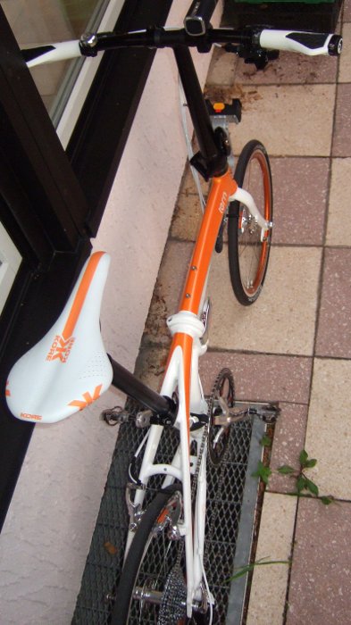 Die Bilder zeigen das Rad mit Shimano PDM 520 Pedalen (die kommen noch neu in weiß hin); außerdem mit dem Klickfixadapter vorne am Rahmen. Eine passende Tasche besorge ich noch. Sitzposition scheint fürs erste angenehm. Lenkerverstellung geschieht über den Vorbau, welcher sich in alle Richtungen kippen läßt.
