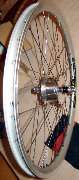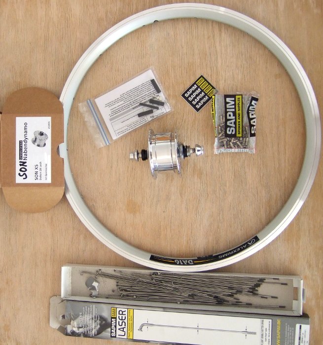 Fürs Tern Klapprad wurde gestern das Vorderrad mit dem nur 74mm breiten SON XS Nabendynamo aufgebaut. Es wiegt 840g. Das Hinterrad war bereits früher fertiggestellt worden. Dann wurde der hübsche schwarze SON Edelux Scheinwerfer vom Big Dummy demontiert und ans Tern verpflanzt. Er passt dort aufgrund seiner zierlichen Größe perfekt. Am Big Dummy wird der größere B&M Cyo RT nicht stören.