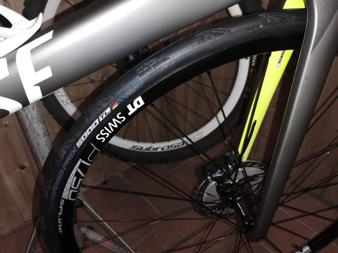 Beim leichten Asfaltrad („Roadbike“) habe ich einen DT P1750 Spline Laufradsatz mit herstellerseitig verbautem tubeless Felgenband. Zwar war das Rad ab Werk mit Leichtschläuchen in den gelieferten Schwalbe Pro One tubeless Reifen montiert, dies wurde aber unter Verwendung von Schwalbe tubeless Ventilen schnell und problemlos geändert. Auch hier während der Saison problemfreier Betrieb bis ich in eine brutale Rollsplitsektion kam, wo offenbar Glassplit oder sowas verwendet worden war. Einen derartig aggressiven Rollsplit hatte ich noch nirgends gesehen, und ich war kurz davor, mich bei der Stadtverwaltung zu beschweren. Bei der Durchfahrt gab es einen fetten Durchstich in der vorderen Reifenlauffläche, der mich seither ärgerte. Das System funktionierte zwar, der Reifen wurde selbsttätig dicht und verlor dabei erstaunlich wenig Luft, die Fahrt konnte also fortgesetzt werden. Aber die Sache wiederholte sich dann gelegentlich, also das Loch war zu groß, um 100% dicht zu bleiben. Immerhin, es war auch dann kein Fahrtabbruch oder Nachpumpen nötig.