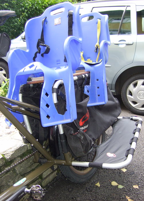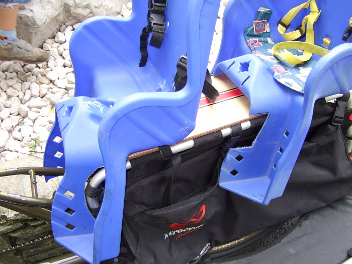 There are several solutions for two child seats on one Big Dummy. Here is mine with two child seats bolted on the snapdeck safely. See my previous articles on mounting the first child seat. It worked similar with the second one.